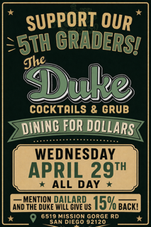 The Duke will generously donate 15% of all order prices back to Dailard. A big thanks to our community for your support of Dailard Elementary.